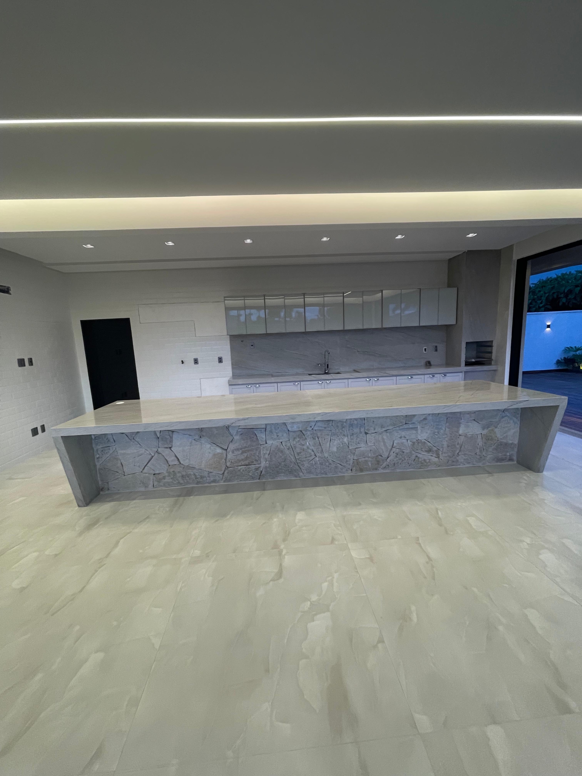 ✅ Área gourmet de alto padrão, com churrasqueira a carvão, bancada de granito Mont Blanc com 6 metros e armários planejados
